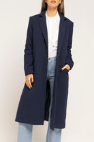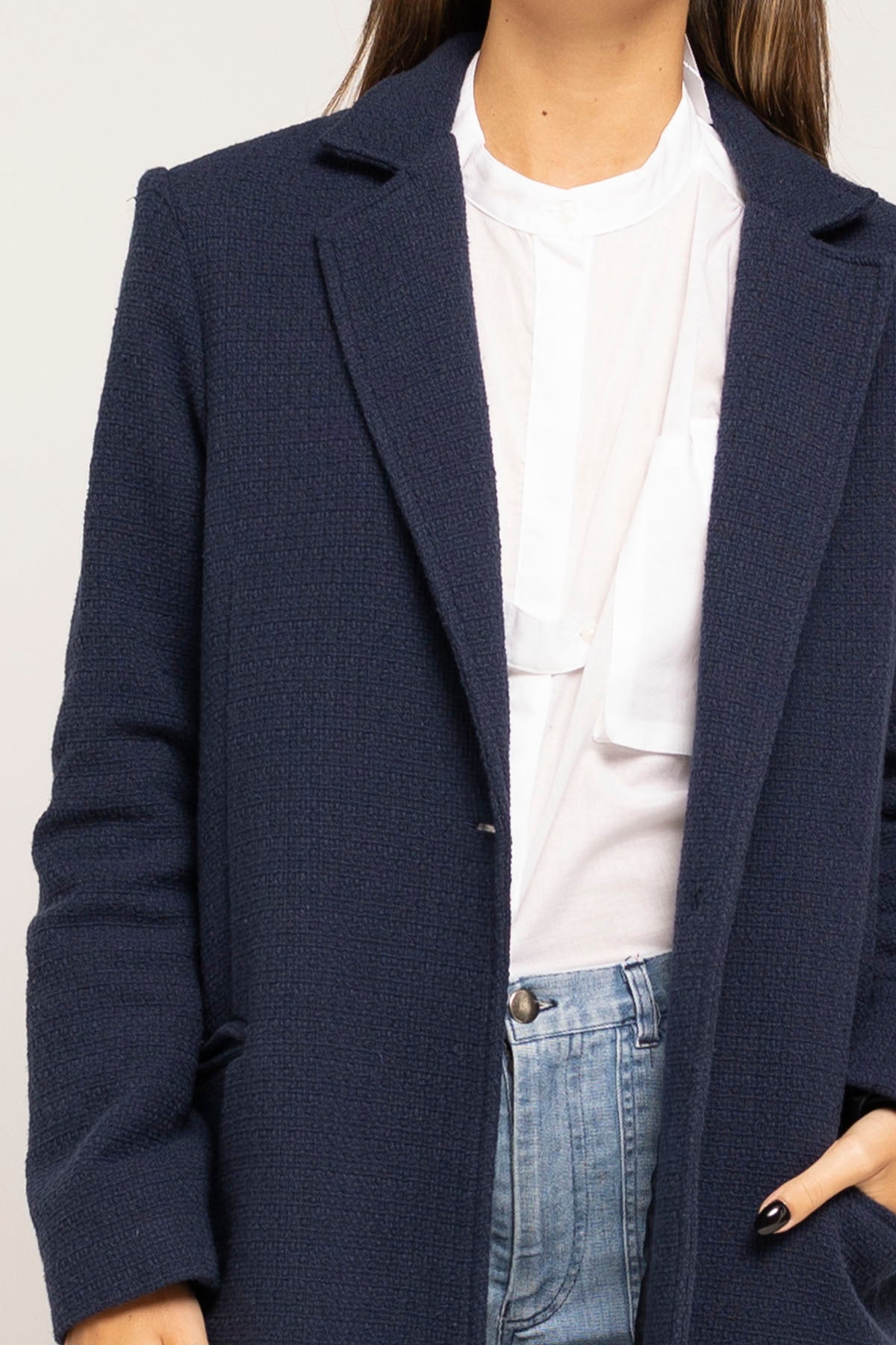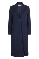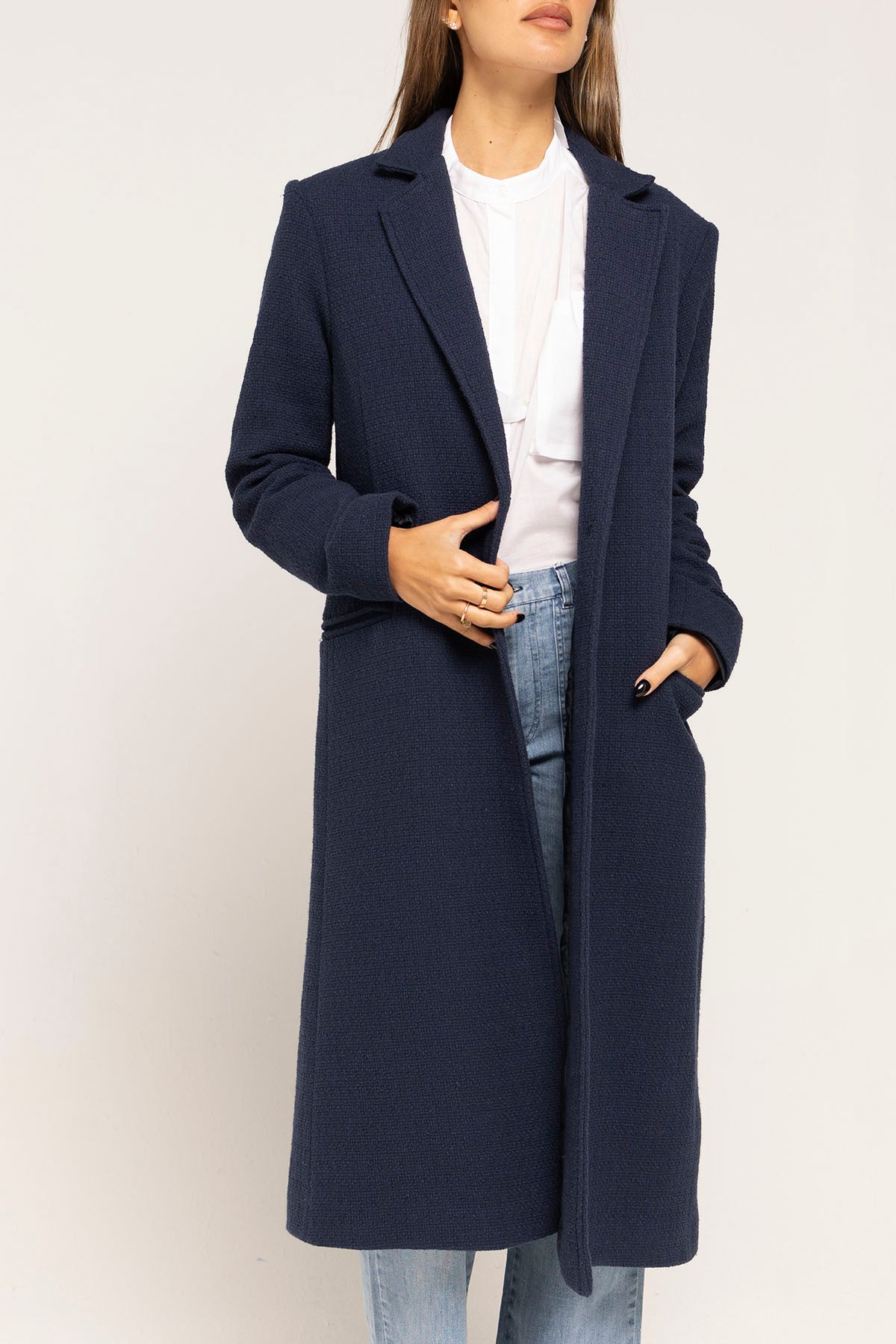 Tailored tweed overcoat with a long silhouette, structured shoulders, deep pockets, and a silk inner lining.