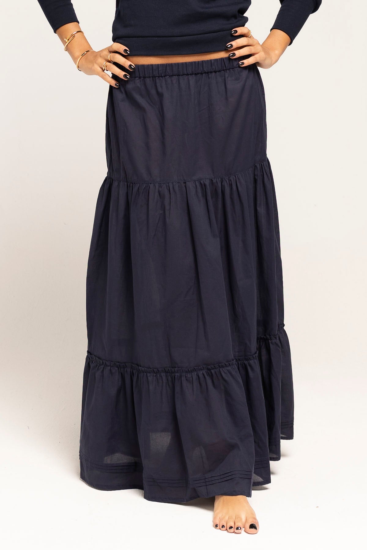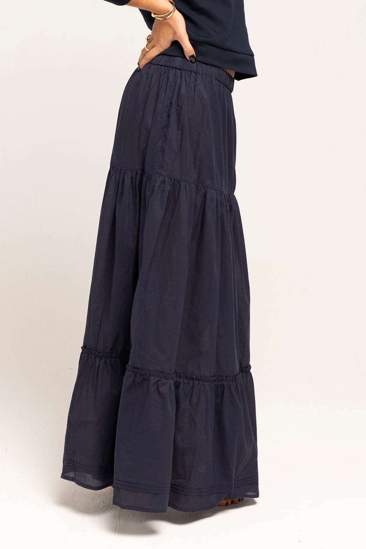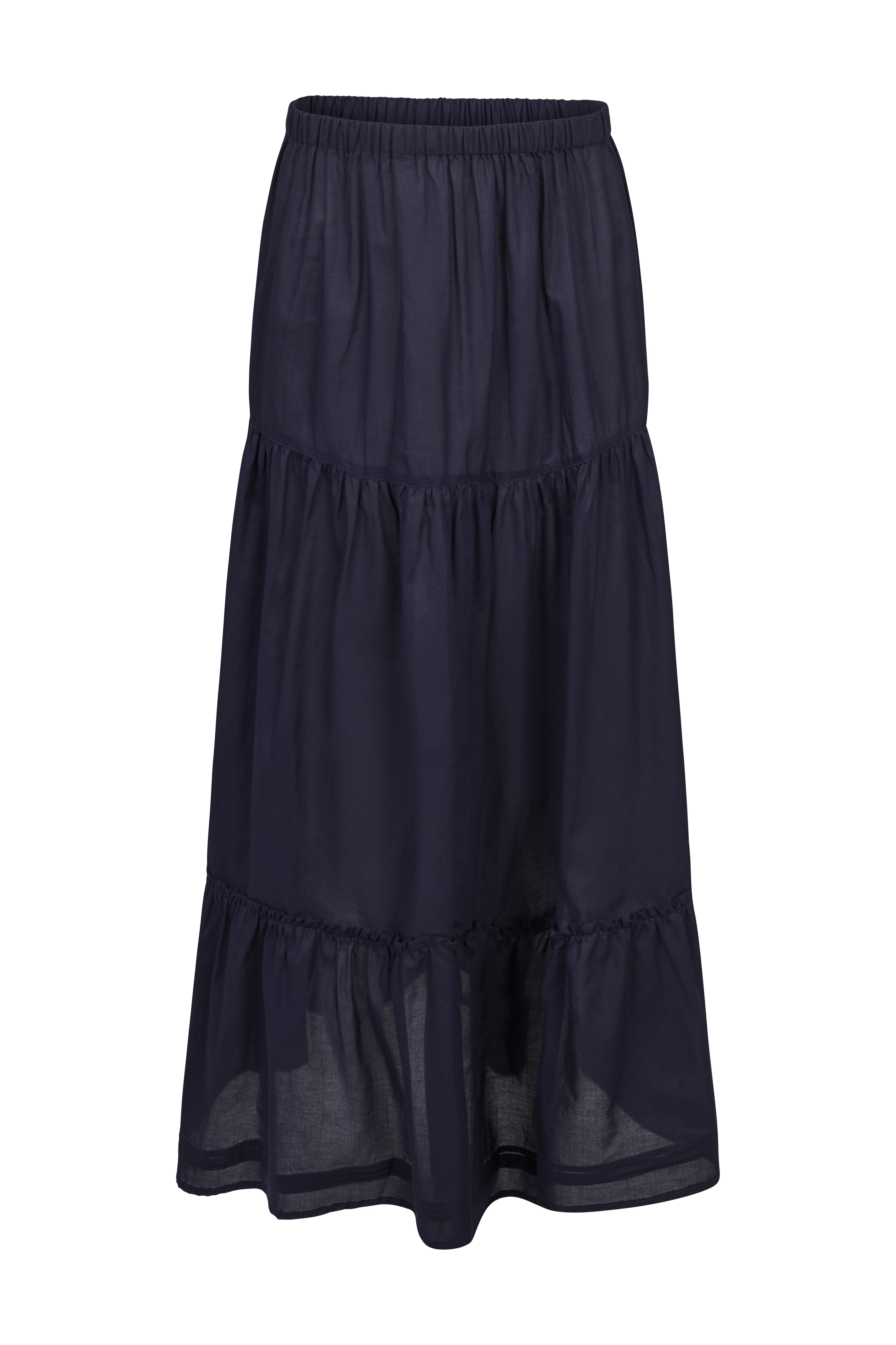 Flowing navy maxi skirt with soft gathers and a clean silhouette. Crafted in our atelier from lightweight, breathable voile cotton with a slightly sheer finish.